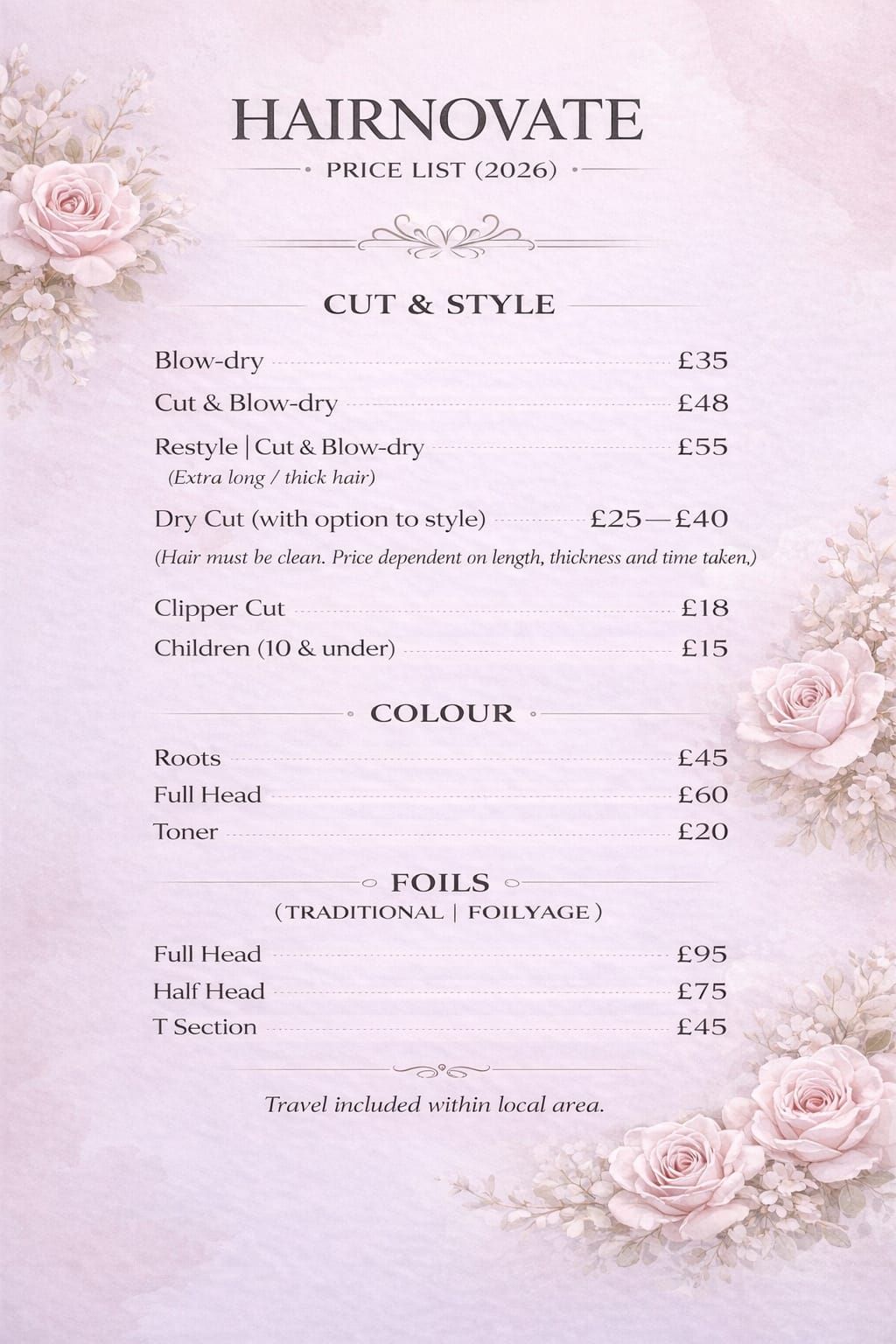 I offer professional colouring services to refresh and elevate your look. Whether you’d like vibrant shades, soft natural tones, or expert grey coverage, I’ll create a colour that suits your style, skin tone, and lifestyle. Using high-quality products, I ensure long-lasting results that leave your hair looking healthy, radiant, and full of life.